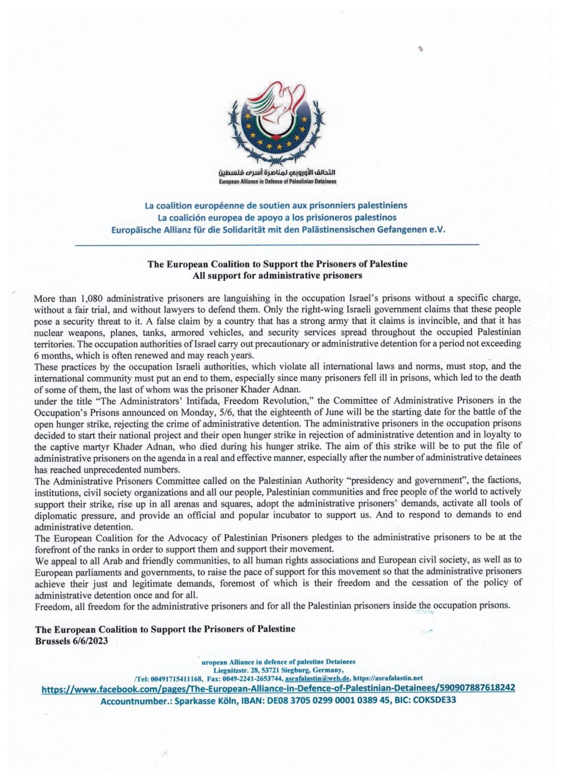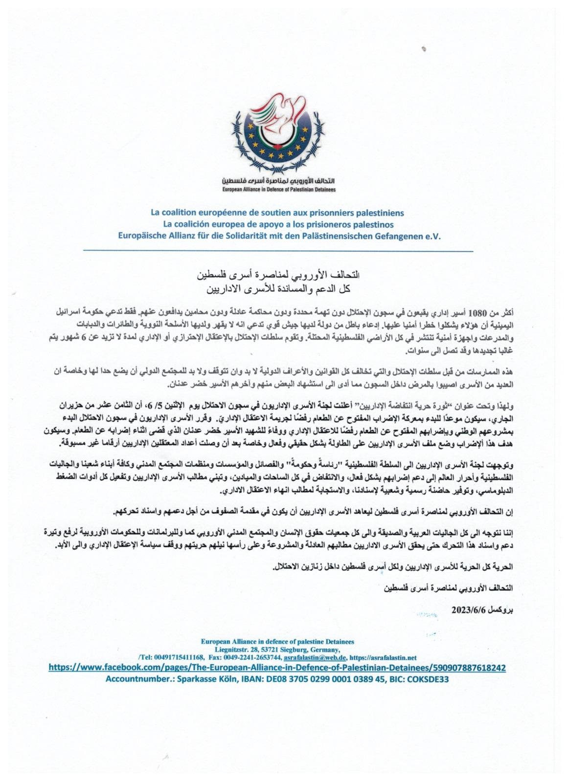 بيان صادر عن التحالف الأوروبي لمناصرة أسري فلسطين دعما للأسري الاداريين 6/6/2023